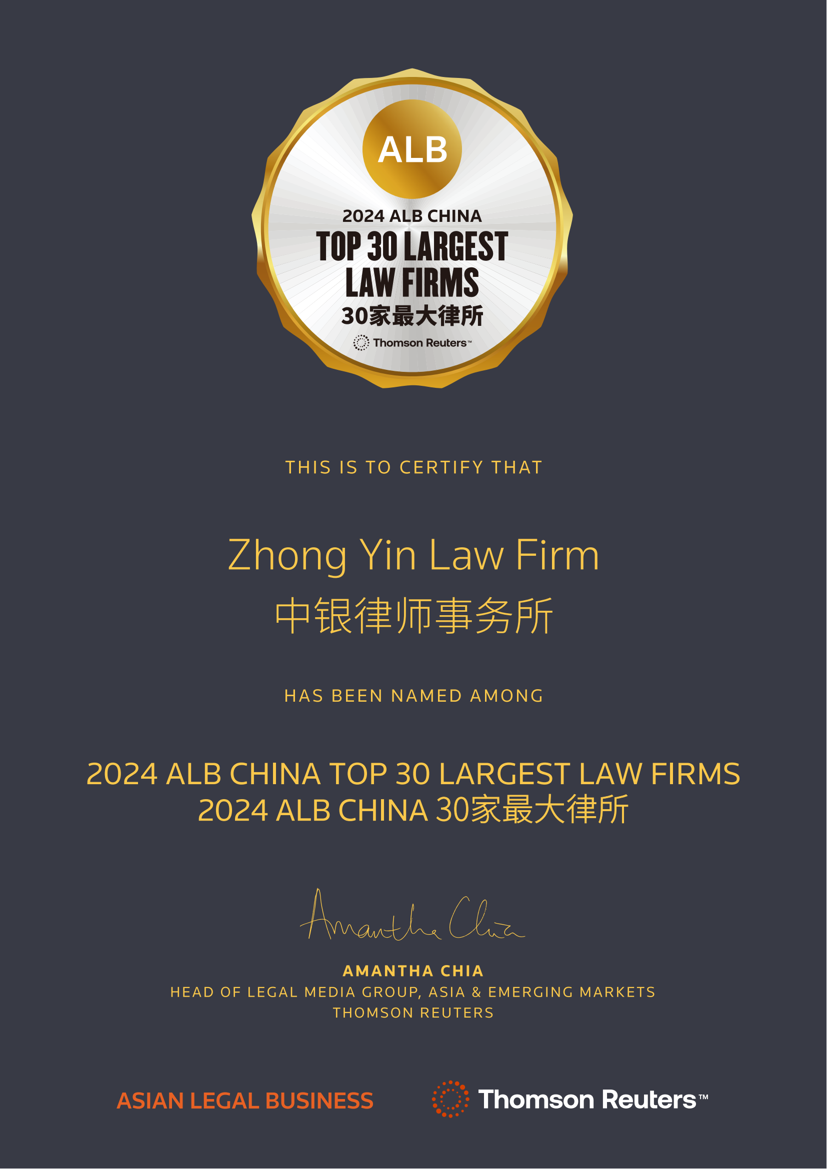 2025年4月,中银律师事务所荣获ALB中国法律大奖“年度诉讼律师事务所”提名。
